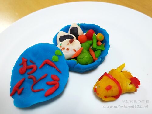 休校休園中の我が家のキッズ、つまらないことでケンカもしますが、基本仲良し。先日、二人で制作をしておりました。で、見せに来てくれた。 小2長女の作、100均小麦ねんどで『おべんとう(左)』と『クレープ(右)』です。 お弁当は、三角おにぎりに、餃子(らし…